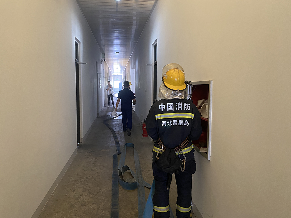 模拟在宿舍发现火情。消防员讲解了自身防护、通讯联络和团队协作要点。公司应急小分队成员与消防员紧密配合,模拟了从火灾警报响起到人员疏散的整个过程。