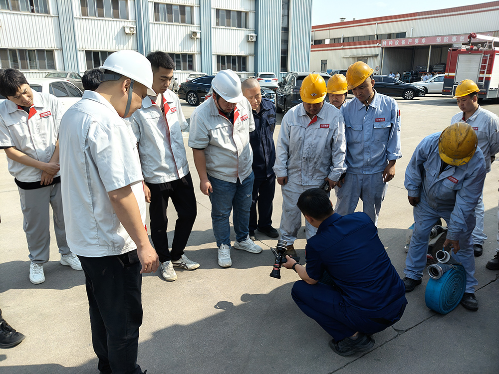 员工实操:来自不同部门的员工代表组成灭火攻坚小组,在消防员指导下反复练习水带连接与出水操作。